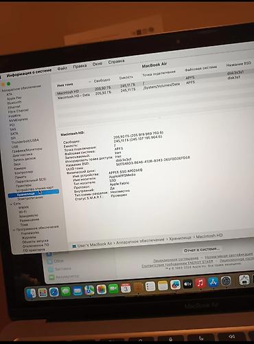 - Накопитель: 256 ГБ SSD (APPLE SSD AP0256Q, NVMe, поддержка TRIM, S.M.A.R.T. проверен)