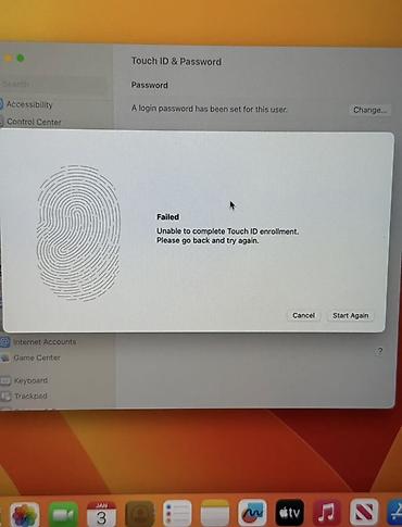 - На фото с экрана — сообщение о неудачной регистрации Touch ID (сканер отпечатков не добавляется). Авторизация паролем работает.