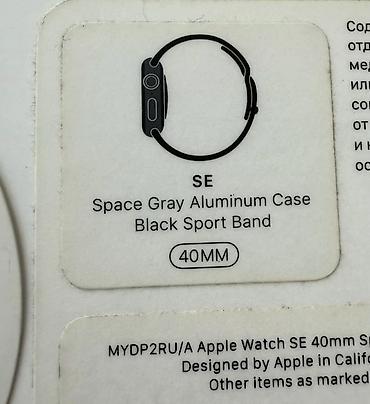 На фото видны реальные часы: передняя и задняя стороны, ремешок и коробка с заводской наклейкой SE Space Gray Aluminum Case Black Sport Band 40MM.