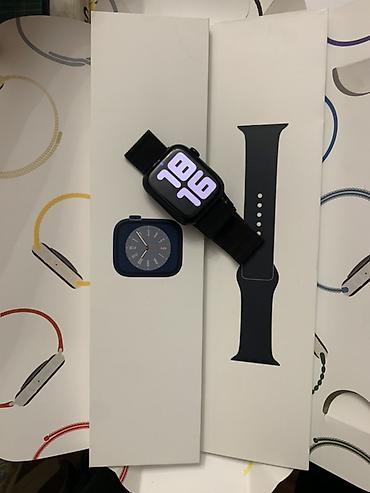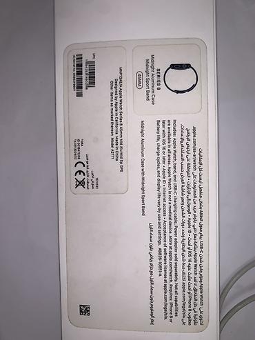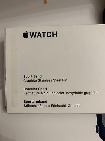 Apple Watch Series 8, размер 45 мм (GPS).SPORT EDITION Алюминиевый корпус в цвете Midnight с задней крышкой из керамики и сапфирового стекла. На фото — комплектная фирменная упаковка и ремешок.