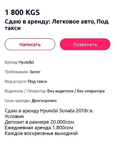 Хундай Cоната арендага берилет 2018г (new rise) Жакында келеген машине, свежая, 2л газ экономичный: - Бизден: шины (зима/лето), двигатель, коробка май алмаштыруу - Айдоочудан ходовка и кузов Тал...