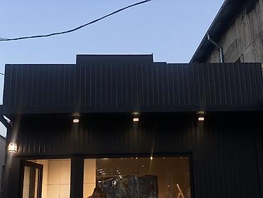 - Фасад: вертикальный металлопрофиль, лаконичный темный цвет, интегрированная фасадная подсветка (несколько точечных светильников над витриной и входом).