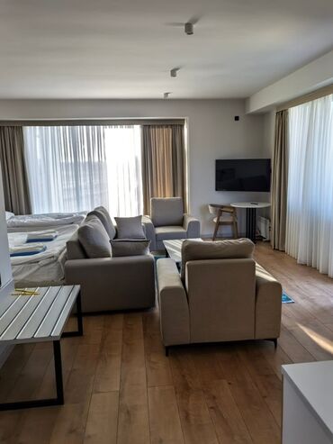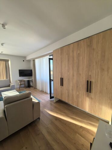 - Планировка: единое светлое пространство с зоной спальни (две кровати, объединяемые в большую), гостиной с диванами и креслами, журнальным столиком и ТВ-зоной, а также рабочим/обеденным столиком у окна. Есть большой встроенный шкаф для хранения.