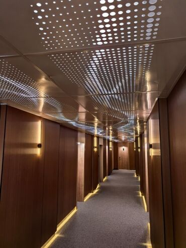 - Санузел (не на фото) в блоке; по коридорам — дизайнерское освещение и отделка деревом, широкие проходы.