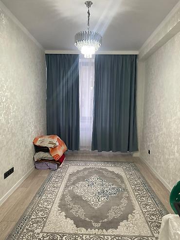 - Светлая комната с декоративными обоями, плотными портьерами (двухцветные: графит и беж), тюлем и люстрой с хрусталем. На полу — большой ковёр с классическим узором.
