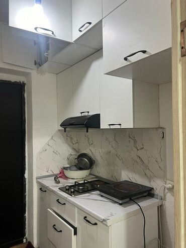 - Кухонная зона: модульный гарнитур с верхними и нижними шкафами, мраморная столешница и фартук под мрамор, мойка с высоким изливом, вытяжка. Варочная поверхность на 2 конфорки (газ), дополнительно электрическая индукционная плитка.