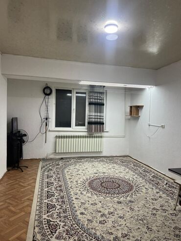 - Жилая комната с окном, радиаторным отоплением, потолочным освещением и большим ковром; паркетный пол. Есть полка, карниз со шторой, розетки и выводы под ТВ/интернет.