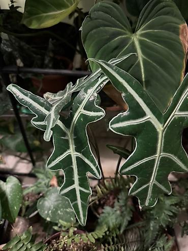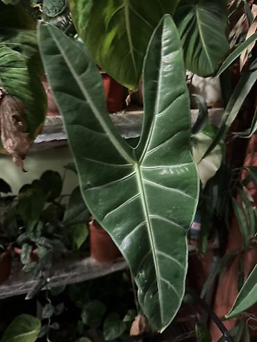 - Алоказия с удлинёнными трёхдольными листьями: насыщённо‑зелёная пластина, выраженные белые прожилки, вертикальный габитус.