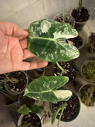 - Алоказия вариегатная (сеянцы/детки): листья с контрастными бело‑зелёными пятнами и секторами, вариабельный рисунок на каждом листе.