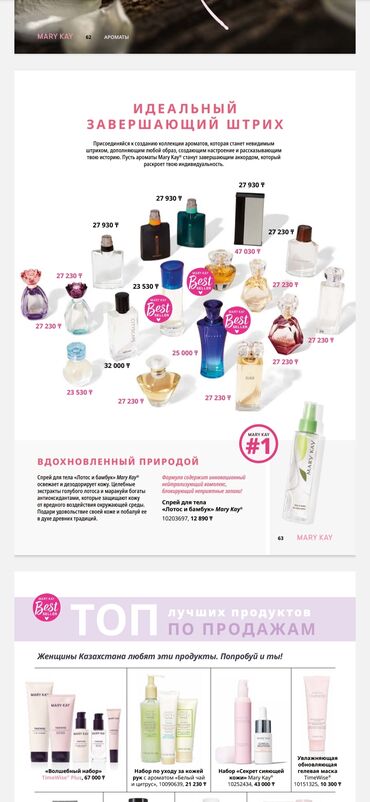 Коллекция парфюмов Mary Kay — завершающий штрих образа: легкие, цветочные, фруктовые, восточные и свежие композиции в изящных флаконах. В линейке представлены женские и мужские ароматы, в том числе хиты с пометкой Best Seller. На изображении указаны цены в тг рядом с флаконами (например: 23 530 тг, 25 000 тг, 27 230 тг, 27 930 тг, 32 000 тг, 47 030 тг).