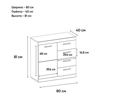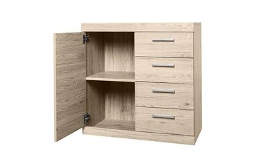 Тумбочка выполнена из ЛДСП. Четыре выдвижных ящика гарантируют удобный доступ к необходимым предметам. Распашная дверца слева скрывает за собой просторные полки. Здесь вы можете хранить посуду, книги или другие вещи.