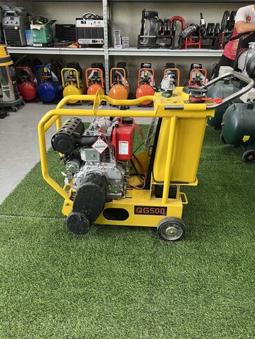 Нарезчик швов QG500, выполненный в желтом цвете, представляет собой компактное устройство на колесах, оснащенное дизельном двигателем. Красный топливный бак и черные элементы двигателя контрастируют с основной желтой рамой. Устройство имеет удобную рукоятку для перемещения и управления. Подходит для различных строительных и дорожных работ, обеспечивая точную резку асфальта или бетона.