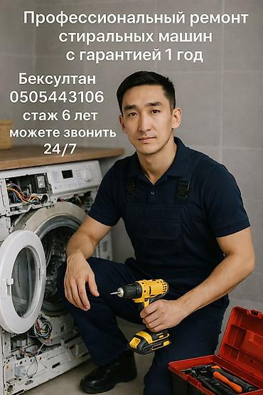 Ассаламу Алейкум! Ремонт стиральных машин всех видов, запчасти оригинал, гарантия на ремонт 9 месяцев Проконсультирую по телефону бесплатно w/p, можно звонить 24/7 Бексултан стаж 6 лет....