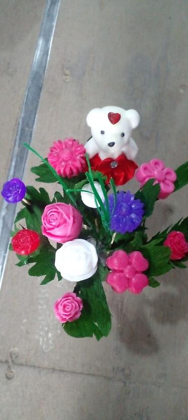 - Подарочная композиция: букет искусственных цветов с декоративной зеленью и мини‑фигуркой медвежонка в платьице с сердечком. Яркие элементы (розы, астры, цветы-сердечки) в розово‑красно‑фиолетово‑белой гамме. Подходит для оформления интерьера и в качестве сувенира.