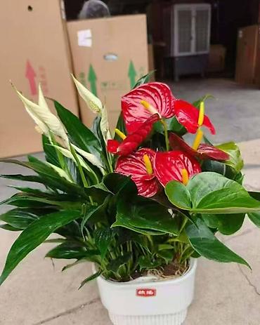 - Комнатная композиция в кашпо: антуриум с красными покрывалами и жёлтыми початками в сочетании со спатифиллумом с белыми соцветиями. Плотная зелёная листва, декоративное белое горшечное кашпо. Подходит для офиса и дома, любит рассеянный свет и умеренный полив.