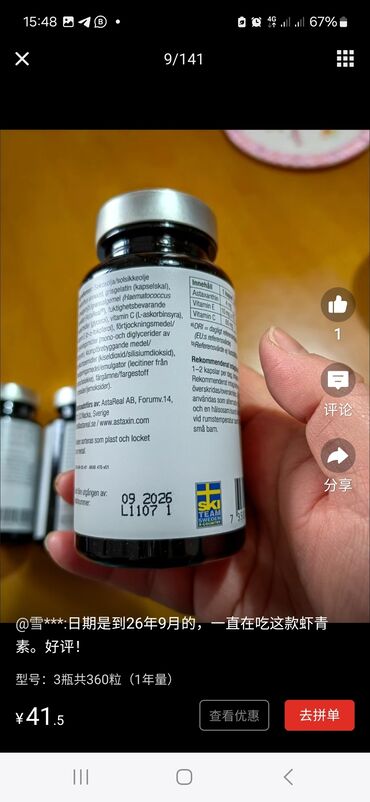 Астаксантин содержится в добавках с лососем, икрой сельди или маслом криля, но его количество в этих источниках гораздо ниже, чем в экстрактах H. pluvialis. Например, уровень астаксантина, содержащегося в капсуле рыбьего жира или крилевого масла, составляет 100 мкг (0,1 мг). Это количество не так велико по сравнению с 4–12 мг на капсулу, содержащимися в большинстве добавок с астаксантином, производимых из водорослей H. pluvialis.