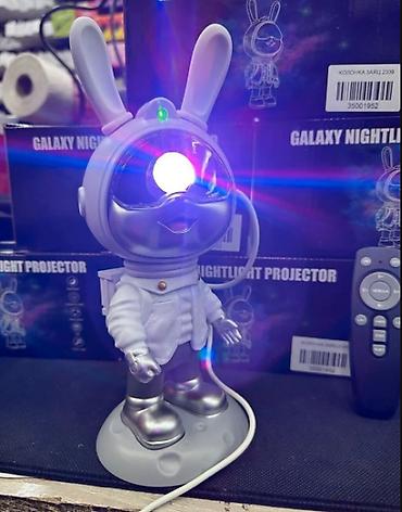 - Фигура забавного зайца-астронавта на «лунной» подставке проецирует звездное небо и цветные световые эффекты на стены и потолок.