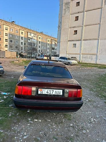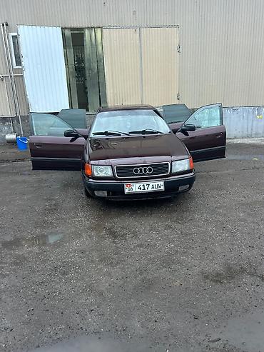 Audi 100 C4 седан, бордовый цвет. Передняя часть с фирменной решёткой и эмблемой Audi, прямоугольные фары, поворотники оранжевого цвета. Металлическая крыша с люком. Чёрные бамперы, тонированные стекла передних дверей. Номерные знаки KG (08, 417 AUW).