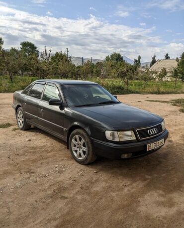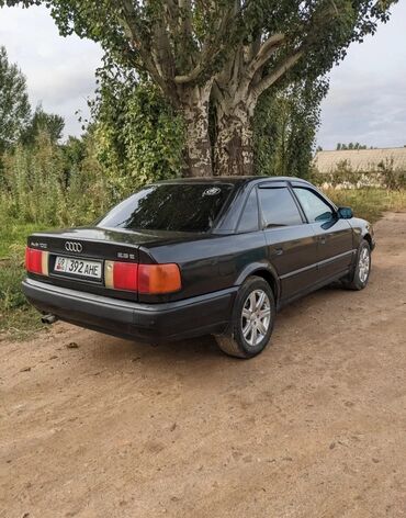 Audi 100 C4, седан, темно-зелёный/графитовый цвет кузова. Киргизские номера (KG, регион 08). Кузов 4-дверный, классический дизайн начала 90‑х с фирменной решёткой и эмблемой Audi на капоте. Основн...