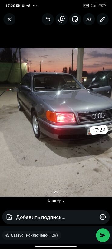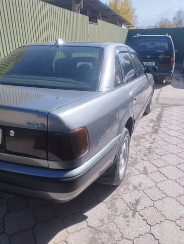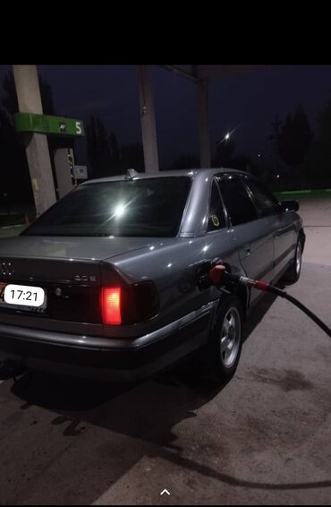 Audi 100 C4 седан, темно‑серый металлик. Атмосферный бензиновый 2.0E, привод на передние колеса. Кузов классической формы с ровными зазорами, заводская оптика, оригинальные литые диски Audi. Тонированные стекла по кругу, молдинги и бамперы в цвет кузова, фирменные эмблемы и шильдик 2.0E.