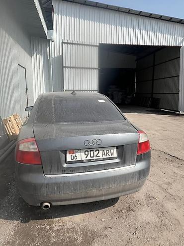 Audi A4 седан, поколение B6. Цвет темно‑серый (металлик). Кузов 4‑дверный, передняя оптика с линзами, оригинальная решетка с эмблемой Audi. Литые диски, низкопрофильные шины. Задняя часть с патрубком выхлопа слева, штатные фонари. Тонированные стекла, антенна «акулий плавник» на крыше. Брызговики, молдинги по бокам, зеркала в цвет кузова. Номерной знак KG.