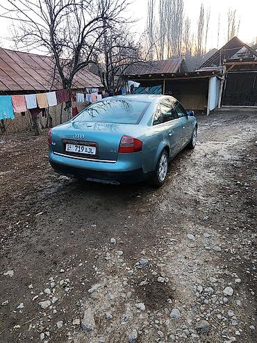 Audi A6 седан, поколение C5. Цвет кузова — голубой металлик. Номерная табличка KG. Сзади шильдик «2.4», бензиновый V6. Кузов 4‑дверный, легкосплавные диски, штатная решётка радиатора с логотипом Audi, противотуманные фары в переднем бампере, повторители поворотов в зеркалах. Задние фонари оригинальные, бампера в цвет кузова. Остекление тонированное по кругу.