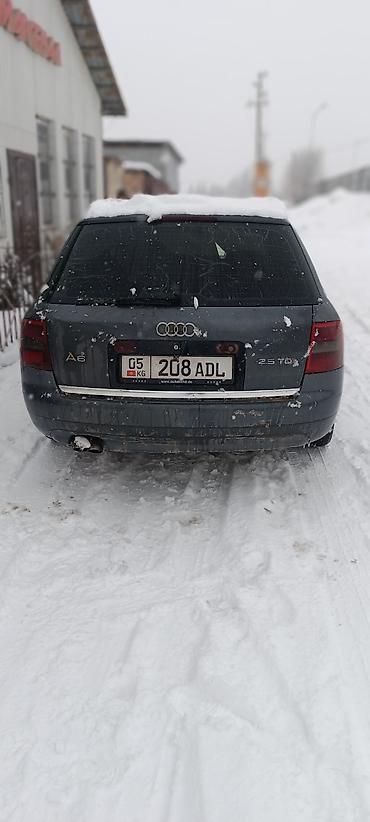Audi A6 Avant (универсал), дизель 2.5 TDI. Полноразмерный багажник с пятой дверью, рейлинги на крыше. Кузов серого цвета. Передняя и задняя оптика в штатных местах, решётка радиатора с эмблемой Audi. Заводские стальные диски, зимние шины. Черные тонированные стекла по кругу, задний стеклоочиститель. Выпускная труба слева, фаркопа нет. Сзади шильдик A6 и 2.5 TDI. Номерные знаки KG (Кыргызстан). Передний и задний бамперы с нижними воздухозаборниками, зеркала в цвет кузова. Универсал удобен для семейных поездок и перевозки грузов: ровный проём багажника, складывающиеся задние сиденья, высокая крыша. Дизельный мотор 2.5 TDI известен экономичностью на дальних трассах, универсал обеспечивает устойчивость на зимней дороге.