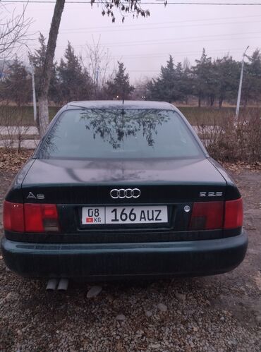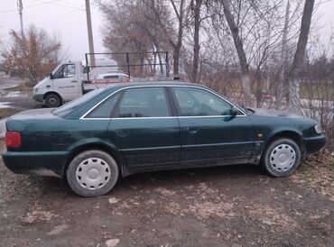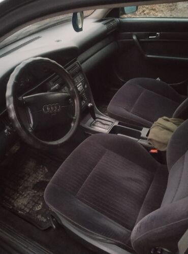Audi A6 C4, седан, темно‑зеленый. Бензиновый двигатель 2.8 V6 (эмблема 2.8 на крышке багажника), автоматическая коробка передач. Передний привод. Цвет салона темный, тканевые сиденья, передние сиденья с выраженной боковой поддержкой. Консоль с штатной магнитолой, климат‑блоком, дефлекторами и нишами хранения, подлокотник/бокс между сиденьями, электрические стеклоподъемники, центральный замок. Рулевое колесо с эмблемой Audi, регулировка колонки, подушки безопасности водителя и пассажира. На полу резиновые коврики.
