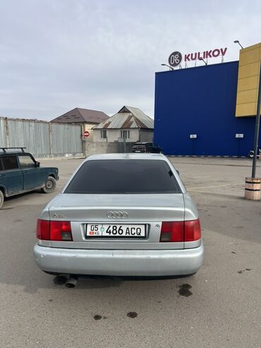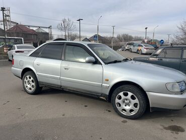 Audi A6 C4 седан, серебристо-серый цвет кузова. Атмосферный бензиновый двигатель 2.8 (V6), задняя эмблема «2.8». Классический дизайн 90‑х, оригинальная решетка радиатора и заводские литые диски Aud...