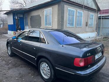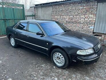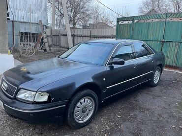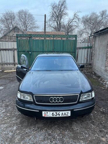 Audi A8 D2, седан, черный цвет. Полноразмерный представительский автомобиль с алюминиевым кузовом, фирменной решеткой радиатора и эмблемами A8/V8 на корме.