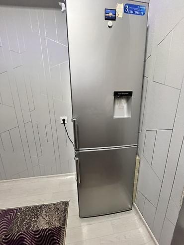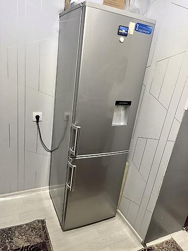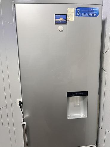 Холодильник двухкамерный, серебристый. Верхняя камера — холодильное отделение, нижняя — морозильник с отдельной дверцей. На двери установлен диспенсер для воды (Water Dispenser) — удобно наливать охлажденную воду без открытия камеры. Вертикальные ручки на обеих дверцах, классический прямой дизайн, корпус из нержавеющей/металлизированной стали под серебро.