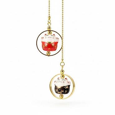 Дизайн: Две керамические (или полимерные) фигурки Манэки-нэко, подвешенные на золотистой цепочке из бусин, каждая в золотистом кольце.