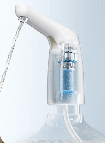 Автоматическая помпа для воды белого цвета, предназначенная для удобного розлива воды из бутылей. Устройство оснащено наклонным носиком для подачи воды и длинным силиконовым шлангом для забора воды со дна емкости. Компактный дизайн позволяет легко устанавливать помпу на горлышко стандартных бутылей. Идеально подходит для использования дома, в офисе или на даче, обеспечивая быстрый и гигиеничный доступ к питьевой воде.