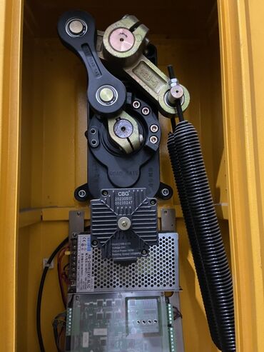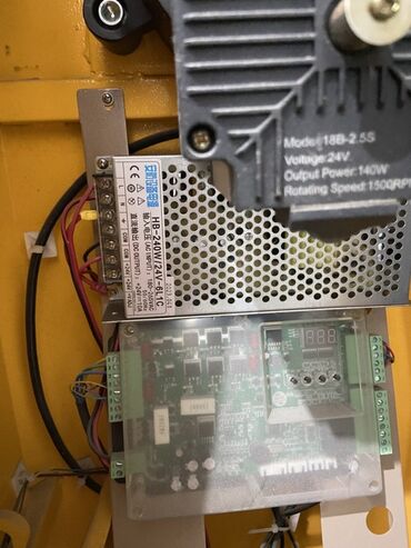 Автоматический шлагбаум желтого цвета, оснащенный белой стрелой с красными светоотражающими полосами. Устройство имеет прочный металлический корпус и предназначено для контроля доступа на территорию. Внутри шлагбаума виден электрический механизм, включающий мотор и плату управления, что обеспечивает автоматизацию процесса открытия и закрытия. Оснащен блоком питания HB-240W/24V-611C, работающим при напряжении 24В и мощностью 140Вт, с выходной скоростью 1500 об/мин. Идеально подходит для организации въезда и выезда на парковках, в жилых комплексах или на промышленных объектах.