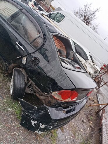 Кузов: седан, чёрный цвет. Сильные повреждения по кругу: передняя часть и телевизор смяты, капот и крылья повреждены, лобовое и боковые стёкла разбиты, крыша деформирована, задний бампер сорван, задняя часть с вмятинами, правая задняя подвеска/узел колеса повреждены. Салон частично уцелел, подушки безопасности сработали/отсутствуют, проводка местами вырвана.