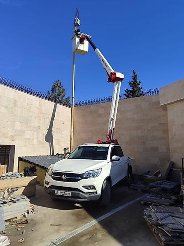 Автомобильная вышка, предназначенная для выполнения высотных работ, установлена на шасси белого пикапа SsangYong. Вышка оснащена телескопической стрелой с рабочей корзиной, обеспечивающей доступ к труднодоступным местам. Это универсальное оборудование подходит для монтажных, ремонтных и обслуживающих работ на высоте, таких как установка рекламных конструкций, обслуживание фасадов зданий или обрезка деревьев. Компактные размеры и маневренность позволяют использовать ее в условиях ограниченного пространства.