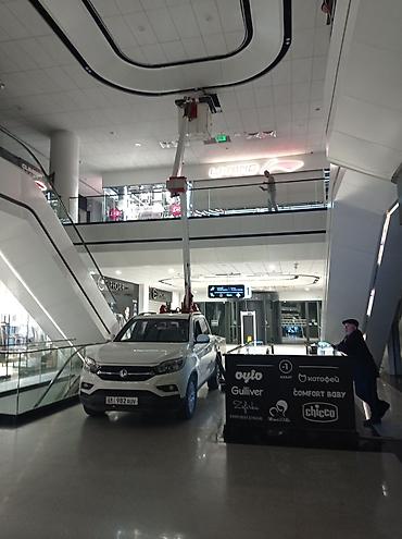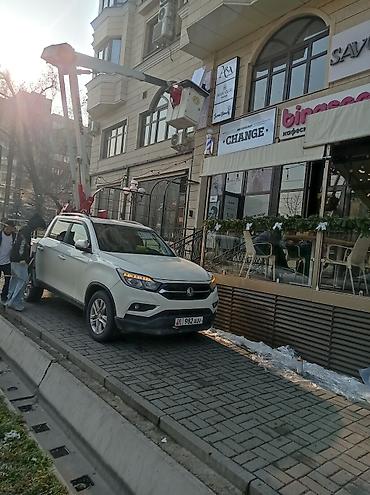 Белый пикап SsangYong Musso, оснащенный подъемником. Автомобиль имеет четырехдверный кузов, легкосплавные диски и рейлинги на крыше. Передняя часть выделяется хромированной решеткой радиатора и про...