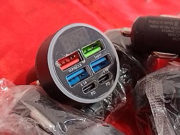 Автомобильное зарядное устройство для прикуривателя (DC 12–24 В) с шестью портами и цифровым индикатором напряжения.