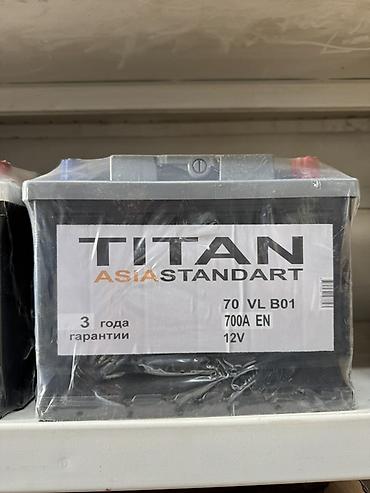 - На фото пример модели: Titan Asia Standart 70 VL B01, 12V, пусковой ток 700A EN, указана гарантия 3 года.