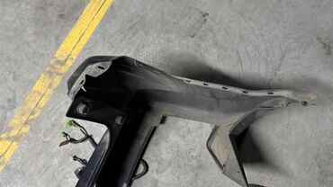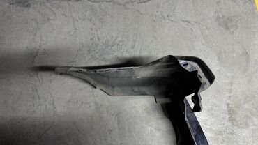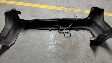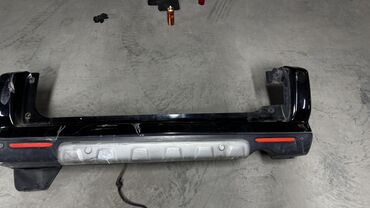 Задний бампер черного цвета с серебристой накладкой. Оснащен отверстиями для датчиков парковки и отражателями по бокам. В нижней части имеются брызговики. Подходит для замены поврежденного бампера или обновления внешнего вида автомобиля.