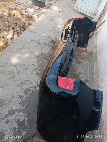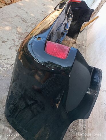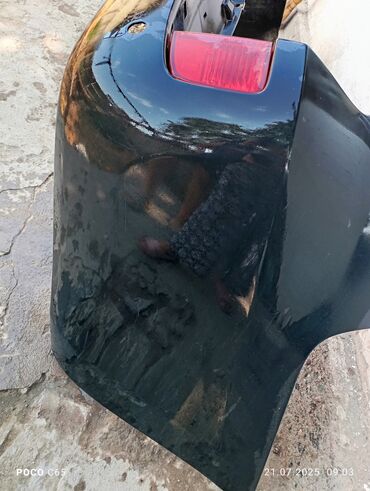 Черный автомобильный бампер с глянцевой отделкой и встроенным красным задним фонарем. Деталь имеет характерную форму, предназначенную для установки в задней части автомобиля. Подходит для замены поврежденного бампера или обновления внешнего вида транспортного средства. Включает вырез для выхлопной трубы и отверстие для крепления.