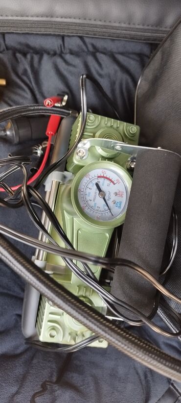 Автомобильный компрессор 12 В (портативный) - Питание: от прикуривателя 12 В (штекер на конце длинного кабеля) - Манометр встроенный, аналоговый, на верхней панели – контроль давления во время нак...