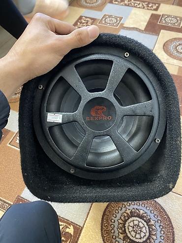 Автомобильный сабвуферный комплект. Состав: - Сабвуфер в массивном закрытом корпусе (ящик с фронтальной решёткой и декоративной графикой). - Усилитель ACV, установлен сверху корпуса. - Проводка пи...