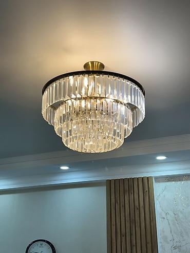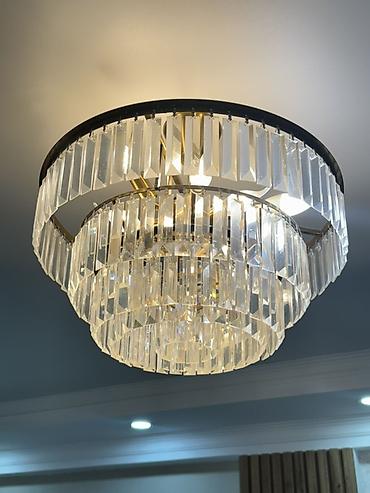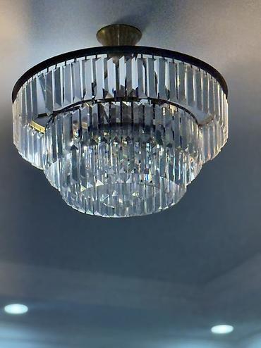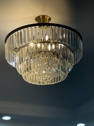 - Конструкция: многоярусная круглая люстра, монтаж «полупотолок» (низкая подвеска на чаше). Три каскада прозрачных гранёных подвесов из стекла/кристалла образуют эффектный кольцевой силуэт.