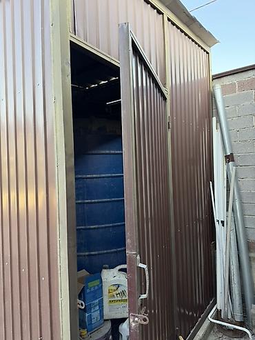 Габариты по фото: бак — крупнотоннажный вертикальный (ориентировочно 2000–5000 л); бокс — примерно размером с небольшой сарай, позволяет полностью спрятать емкость и расходники.