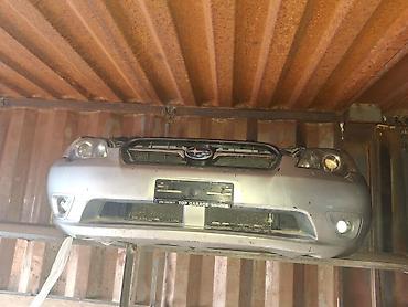 Передний бампер Subaru, окрашенный в серебристый цвет, представляет собой цельную деталь с интегрированными фарами, решеткой радиатора и местом для крепления номерного знака. Он оснащен отверстиями для противотуманных фар и вентиляционными решетками для охлаждения. Подходит для замены поврежденного или изношенного элемента кузова, восстанавливая первоначальный вид автомобиля.