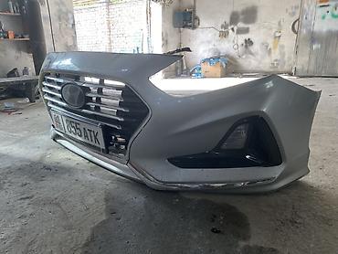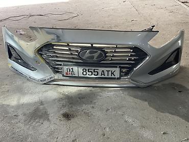 Передний бампер в сборе для Hyundai Sonata (дорестайлинг/рестайлинг поколения LF/YF — уточняйте по форме). Цвет — серебристый. Комплектация по фото: