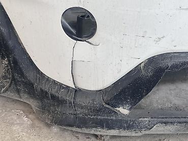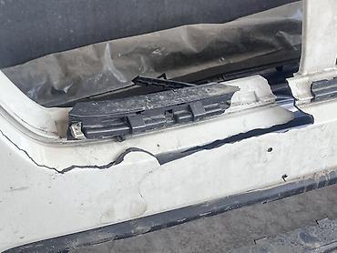 Передний бампер (серебристый), пластиковый. Особенности: - Имеются значительные повреждения на центральной и правой частях, трещины и потертости по лицевой поверхности, локальные деформации кромок...