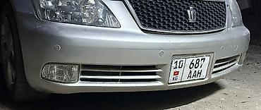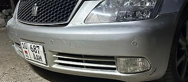 Передний бампер для седана Toyota Crown (кузов S180, рестайлинг). Оригинальный серебристый бампер с заводской решёткой и эмблемой Crown, комплектуется: