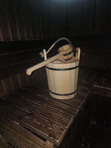 - Традиционная деревянная парная с мягким освещением, широкими полоками и вёдром с черпаком.